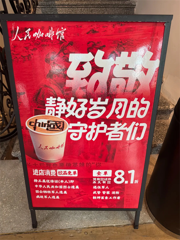 一杯咖啡的文明传递早上10点,中华巴洛克历史文化街区上的人民咖啡馆刚开门,等待已久的游客就挤满了咖啡厅。尽管生意很忙,店长荆怡鑫还是先把两个贴有“免费畅饮”的布告牌摆到门口最醒目的位置。牌上分别写着:“环卫工人自带杯可免费提供饮品,欢迎进店休息”和“致敬静好岁月的守护者们,持三属有效证件饮品免费”。