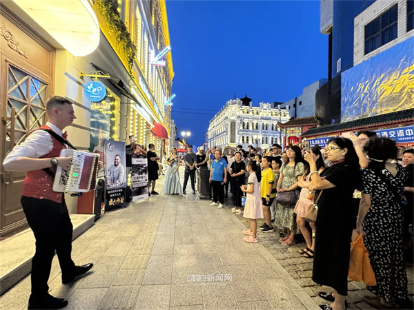 现场,来自俄罗斯的乐手以小提琴、手风琴等乐器,演奏了《我爱你塞北的雪》《茉莉花》等作品,优美的旋律飘扬在街区,化作别样邀请函,引得中外游客和市民纷纷驻足,共同感受音乐的美好。