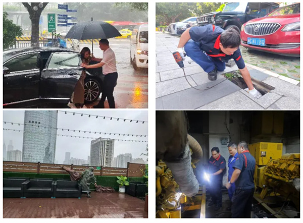 安保运行部员工们同样是节日里不可或缺的守护者。节日期间,广州强台风、强降雨等极端天气接连不断,他们在大雨中,为顾客撑伞遮雨,护送客人安全进出;对天台等设施设备进行加固,搬运沙袋防御积水,提前疏通排水管道。同时加强了酒店安全巡查与设施维护,确保水电供应稳定、消防通道畅通、环境卫生整洁,为酒店宾客筑牢了安全防线。财务、企划营销、办公室等各个后台部门也加班加点,完成营收数据核算、活动推进、物资采购保障等工作。