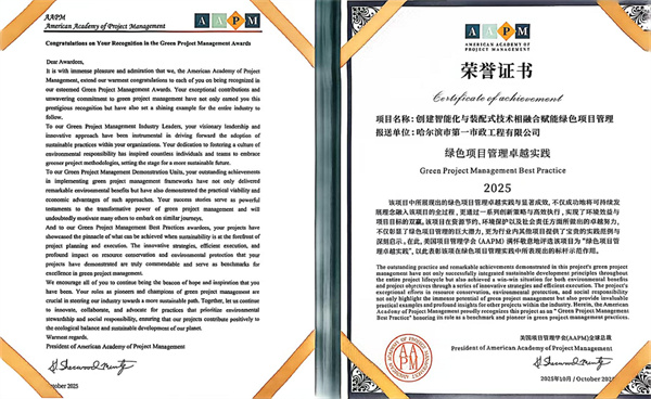 哈尔滨城发投集团权属企业建设集团市政一公司申报的“创建智能化与装配式技术相融合赋能绿色项目管理”获评“绿色项目管理卓越实践”奖项。值得一提的是此次共有40项“绿色项目管理卓越实践”凭借其前瞻理念、创新方法与突出成效,成功进入终审环节并获表彰,黑龙江省占有2项。